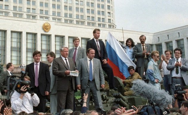 Заглавная иллюстрация. Апофеоз Ельцина. Борис Николаевич на танке у Белого дома зачитывает обращение к народу о подавлении выступления ГКЧП.