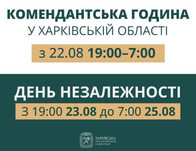 В Харькове и области в День независимости вводят длительный комендантский час с 19:00 23 августа до 7:00 25 августа.