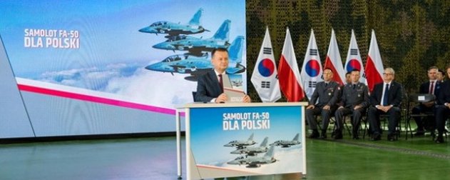 Танк K2 Black Panther армии Южной Кореи «16 сентября 2022 года на 23-й тактической авиабазе военно-воздушных сил Польши в Минске-Мазовецком в присутствии президента Польши Анджея Дуды министр национальной обороны Польши Мариуш Блащак утвердил контракты с южнокорейской корпорацией Korea Aerospace Industries (KAI) на закупку Польшей 48 легких боевых самолетов FA-50. Были утверждены два контракта: первый стоимостью 700 млн долл) на поставку со стороны KAI двенадцати самолетов FA-50 Block 10, и второй стоимостью около 2,3 млрд долл. на поставку со стороны KAI 36 легких истребителей в модифицированном варианте FA-50PL. Оба контракта также включают пакеты логистики, обучения и технической поддержки».