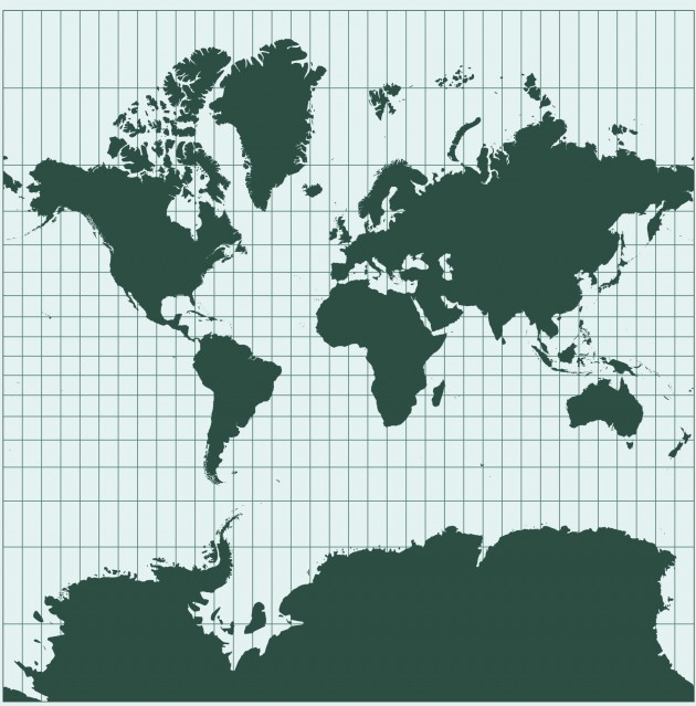 Проекция Меркатора © Shutterstock/FOTODOMОдна из самых распространённых проекций — проекция Меркатора, созданная в 1569 году. Она была особенно полезна мореплавателям, так как маршруты на такой карте остаются прямыми линиями. Но у этой точности есть цена — серьёзные искажения размеров. Так, Гренландия кажется почти такой же большой, как Африка, хотя на самом деле Африка в 14 раз больше.