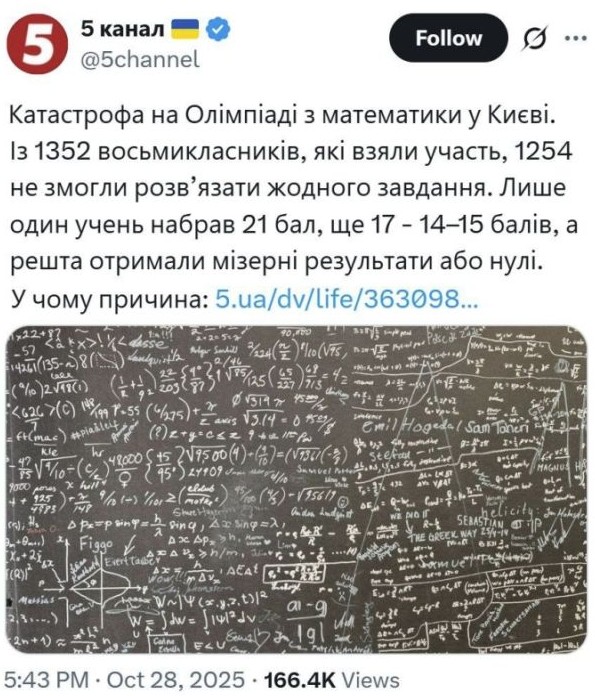 В Киеве на математической олимпиаде произошла, без преувеличения, катастрофа, полностью характеризующая уровень системы образования в «незалежной»: из 1352 восьмиклассников, принявших в ней участие, 1254 учеников не смогли решить ни одной задачи. Лишь один школьник получил 21 балл, еще семнадцать получили по 14-15 баллов, а у остальных были низкие оценки или вовсе нули.