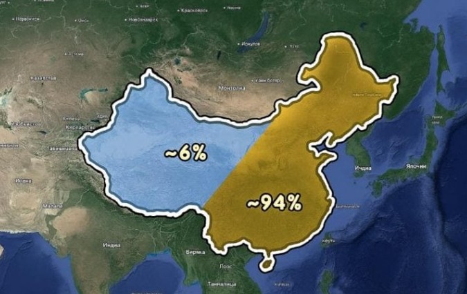 И цифры тут говорят громче всего: примерно 94% населения Китая живёт восточнее этой линии — на территории около 43% страны. А на остальной площади проживает всего около 6% жителей. Почти век прошёл, население выросло, экономика изменилась, появились скоростные поезда, смартфоны и «умные» города, но этот демографический расклад почти не сдвинулся.