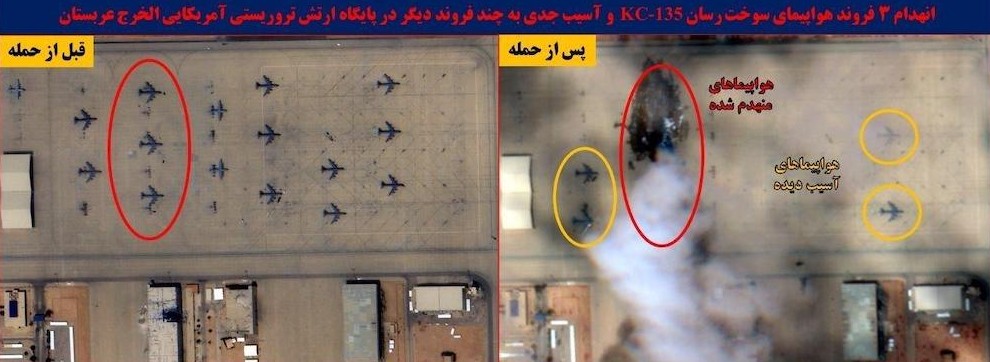 Иранские медиа опубликовали спутниковые снимки авиабазы Принс Султан в Саудовской Аравии, на которых запечатлены последствия недавнего ракетного удара. Как сообщает издание The Wall Street Journal, ссылаясь на американских чиновников, в результате атаки были повреждены пять самолетов-заправщиков KC-135 Stratotanker. Эти машины являются «кровью» современной авиации: без них радиус действия американских истребителей сокращается в разы, что ставит под вопрос эффективность наступательных операций в регионе.