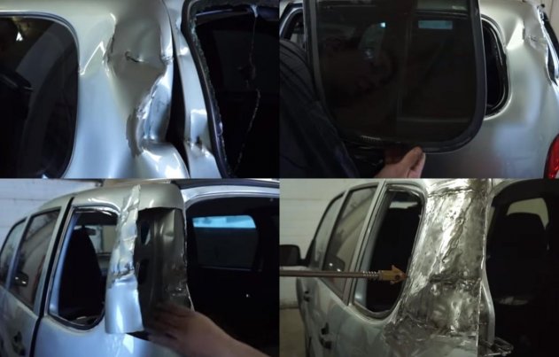Погнутое крыло равнялось изнутри машины с помощью молотка и долота. Также частично равнялась и багажная дверь. Там, где металл не поддавался выравниванию, его приходилось резать болгаркой, ведь в некоторых местах кузова металл используется в два слоя.