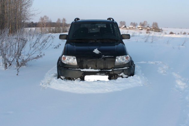 Вседорожный тест-драйв владелец УАЗ «Патриот» начал с включения понижающей передачи и режима Off-Road – на второй «понижайке» российский внедорожник с трудом преодолевает пересеченную местность, засыпанную густым снегом, несмотря на то, что автомобиль «бампером собирает снег».