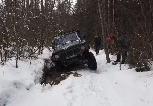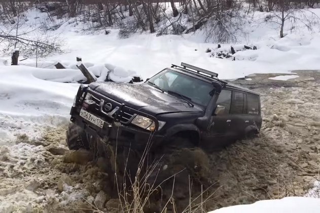 После все машины были испытаны заснеженной дорогой, по которой им нужно было проехать так, чтобы левая сторона двигалась по дороге, а правая – по «желобу» с грязью и водой. Здесь тоже все справились с задачей, но Nissan Patrol с мотором 2.8 выглядел не так проворно, как «тракторы».