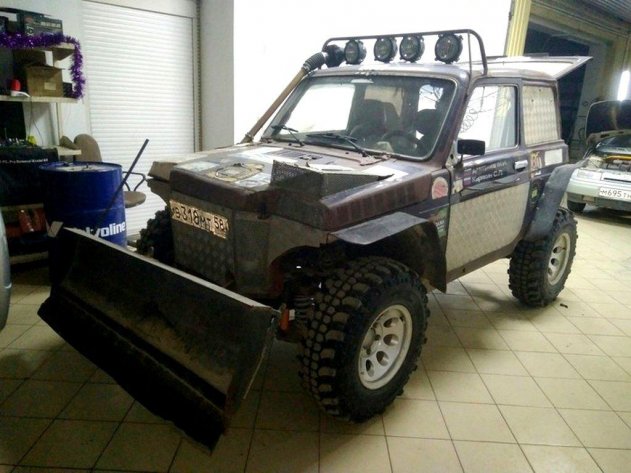 Вместо переднего бампера к ВАЗ-2121 владелец прикрепил небольшой ковш, по-видимому, предназначенный для уборки снега или вспахивания полей. Благодаря столь необычному тюнингу, автомобиль действительно начал напоминать то ли трактор, то ли гоночное багги, в которых обычно устраивают состязания по песчаным дюнам.