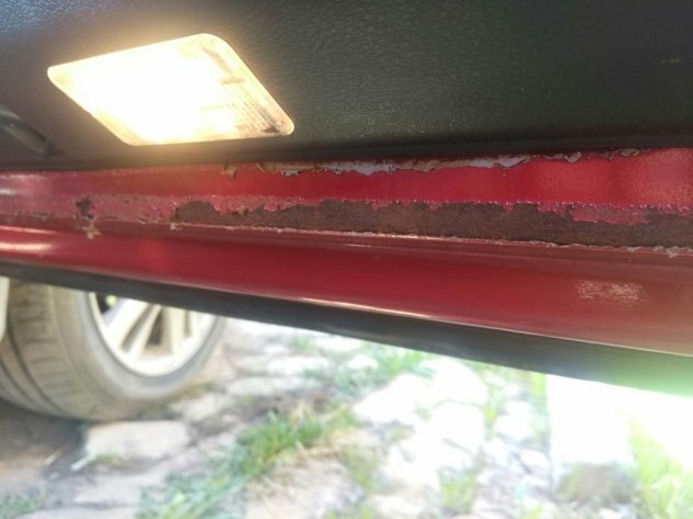 Очаги поражения ржавчиной настолько широки, что краска облезла едва ли не с половины длины детали. При этом, «Весте» всего лишь 3 года и водитель не может понять, как такое могло произойти с почти новой машиной.