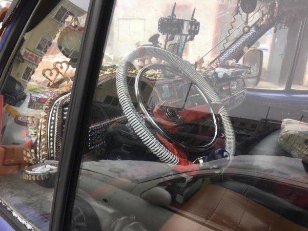 Стоит сказать, что в салоне машины ее владелец проявил фантазию не меньше, чем в ее экстерьере. Автомобиль получил «баранку» в ретро-стиле, пластиковые панели грузовика украшены разноцветными камнями и бисером, а уют в машине создают шторки, свисающие с потолка.