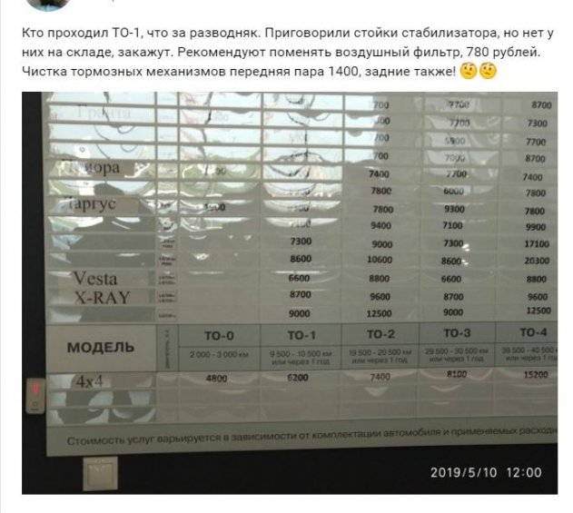 В социальной сети «ВКонтакте», в группе для владельцев LADA Vesta, один из автомобилистов поделился опытом прохождении ТО-1. Цены на технические работы его мягко говоря возмутили. Так, автовладельцу порекомендовали заменить воздушный фильтр за 780 рублей и почистить тормозные механизмы – 1 400 рублей за каждую пару. Также должны были заменить стойки стабилизатора, но их не оказалось в наличии. «Что за развод?», – пожаловался на «конские» цены «веставод».