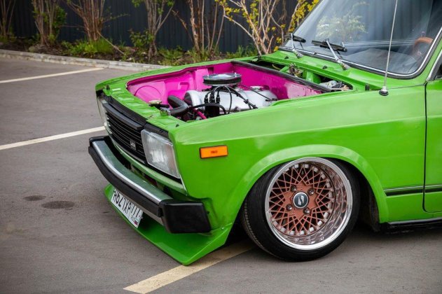 Сначала он поменял у ВАЗ-2105 колеса: передние 6,5-дюймовые и задние 7-дюймовые. Затем добавил хромированные фонари, которых у 36-летней «пятерки» изначально не было, и «губу» на бампер. Подвеску сделал пневматическую, четырехконтурную, заказал классические чехословацкие фары, сам собрал радиаторную решетку для ВАЗ-2105 из других двух, покрасил подкапотное пространство в ярко-розовый цвет, а также добавил люк с натяжным верхом, что помогает справляться с жарой в летний период.
