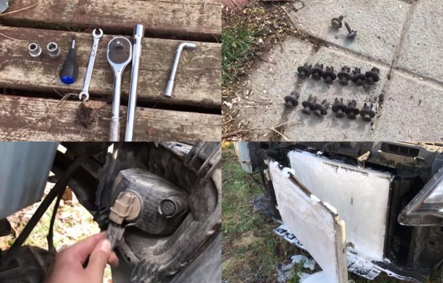 Далее нужно открыть капот – над капотом располагается большая пластиковая панель, которую держат четыре шурупа. Их тоже следует открутить ключом на 10, после чего отсоединить бампер от крыльев и от креплений под фарами. Далее отсоединяются клеммы от ходовых огней, после чего можно полностью снять бампер.