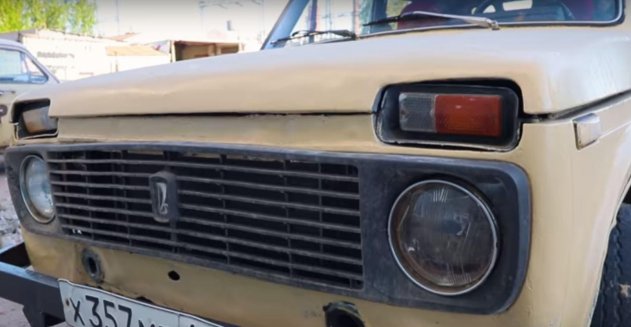Также у «Нивы» криво лежит капот и отсутствует правое зеркало, а салоне установлены сидения от BMW, которые уже довольно сильно износились.