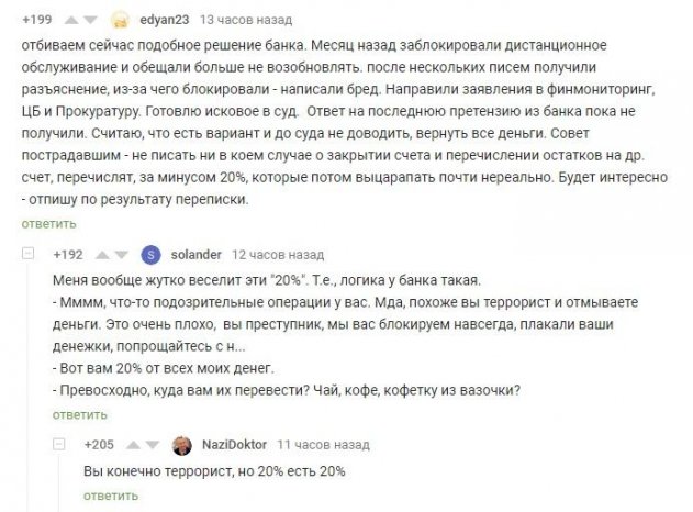 По мнению автора публикации, банк нашел отличный способ «рэкета» денежных средств у малого бизнеса. С помощью закона, который они трактуют по собственному желанию, «получается необоснованное обогащение и пользование чужими активами». Также согласно букве закона, банк не имеет право не называть причину блокировки расчетного счета и легализовать доходы при помощи комиссии.