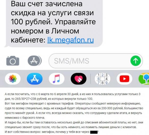 «Учитывая, что до этого я платила 265 рублей, условия показались мне просто сказочными, но есть одно, но: позвонили мне аккурат через пару дней, как списалась абонентская плата. Я девушку спросила, как с этим быть, на что она мне ответила, что абонентская плата будет возвращена на счёт, но не полностью, а согласно неиспользованным дням», - пишет девушка в своей публикации.