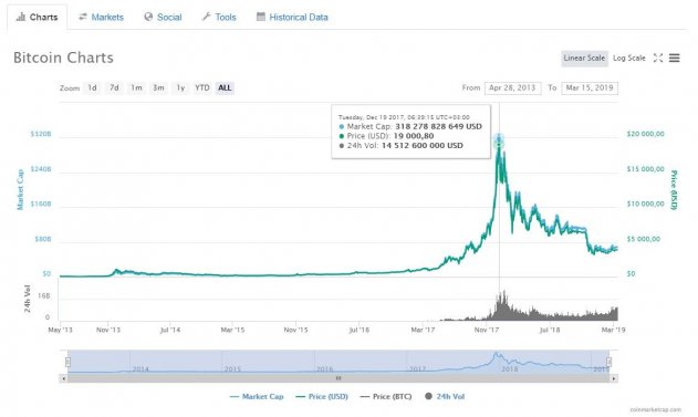 Однако, в соответствии с законами экономики, после взрывного роста произошёл закономерный спад. К концу марта 2019 года цена биткоина составляет $3 914, а его рыночная капитализация упала до $68 848 012 297. Это вызвало сомнения в надежности криптовалют как вида инвестиций.