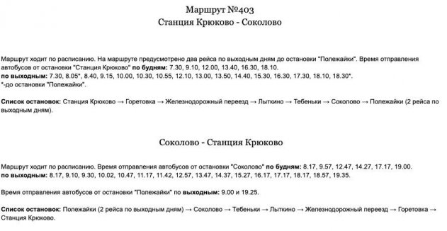 Автобусы, которые работают на маршруте № 403 «Станция “Крюково”» — «Деревня Соколово», с 1 мая начнут курсировать каждый день с 07:30 до 18:20 по мск. Кроме того, ежедневно эти автобусы смогут совершать два рейса до поселка Полежайки. Точное время отправления от станции Крюково — 07:30 и 18:20.