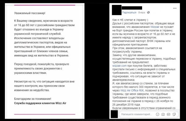 Позже россиянин обратился на «горячую линию» авикомпании, но там, как оказалось, ни о каких спецтребованиях никто не знает. Мужчина добавил, что подобный «беспредел» наблюдается лишь в Wizz Air, так как другие авиакомпании без проблем обслуживают россиян на украинских рейсах. Он обратился к своим знакомым с просьбой распространить его пост в Facebook, дабы избавить путешествующих в Украину россиян о «странностях» Wizz Air.