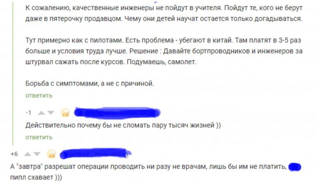Родители будущих и настоящих школьников считают, что данная инициатива возникла потому, что система образования трещит по швам. Мало того, что большинство преподавателей предпенсионного возраста, так еще и без диплома приходить будут.