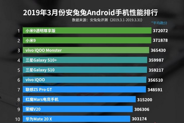 С небольшим отрывом второе место занял Vivo iQOO Monster, «недотянув» примерно 6000 балов. Далее идут Samsung Galaxy S10 и Galaxy S10, Vivo iQOO, Lenovo Z5 Pro GT, Nubia Red Magic Mars, Honor V20 и Huawei Mate 20 X.