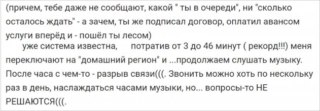 Обладатель домашнего интернета от МТС в регионе пожаловался на слишком долгое ожидание ответа оператора. Сам герой истории проживает в Москве, но порой приходится решить проблемы, которые возникают с домашним интернетом в регионе. И тут начинается самое интересное. Пытаясь дозвониться по телефону горячей линии, необходимо потратить колоссальное количество времени – «рекорд» героя истории – 46 минут. Но и выбрав нужную категорию вопроса, никто не спешит переводить звонок на оператора колл-центра. Приходится ждать ещё порядка часа, а после разговор попросту прекращается. Мужчина не единожды пытался дозвониться таким образом, чтобы решить вопрос в регионе с домашним интернетом, но как в известной басне – «воз и ныне там».