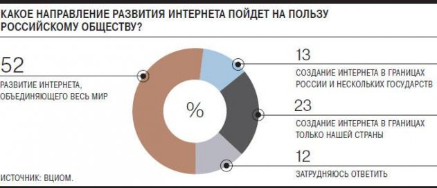 По данным опроса, 52% людей считают, что России необходим свободный интернет, который делит пространство со всем миром. Из них лишь меньше половины понимают, что речь идет о свободе человека, а не о возможности подключаться к иностранным сайтам с музыкой, фильмами и играми.