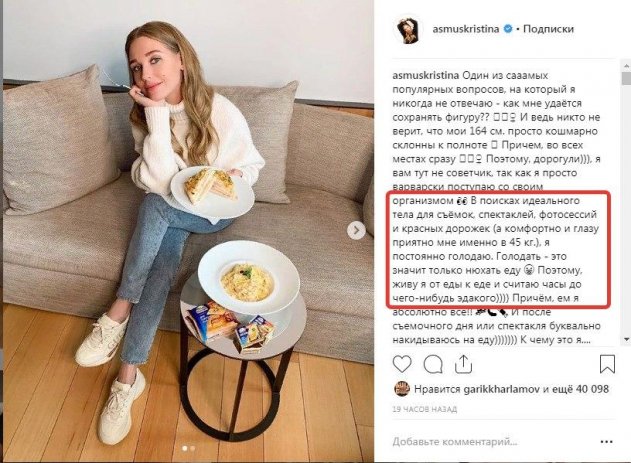 Сегодня на своей странице Instagram Кристина рассказала, что фанатов очень волнует вопрос как ей удаётся держать себя в форме и не толстеть. Ответ очень прост: Кристина часто голодает и не разрешает себе есть перед спектаклями и концертами. Девушка согласна, что это варварский метод не самый лучший, но по-другому она не может. Кристина говорит, что в дни голодовок разрешает себе только нюхать еду.