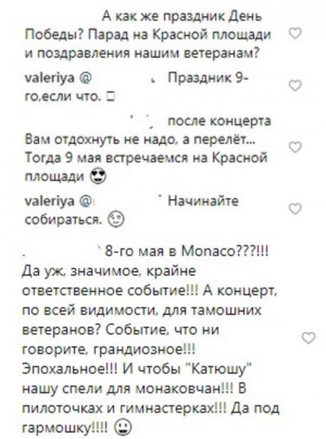Певица на своей странице в соцсети с помпой анонсировала выступления в Монако 8 мая. Компанию на шоу ей составят Валерий Меладзе, Ани Лорак и Эмин. Валерия сообщила, что, помимо сольных выступлений, будут обязательные полюбившиеся публике дуэты. Хорошо зная нашу звёздную тусовку, фанаты уверены, что после концерта артисты останутся в Монте-Карло, чтобы продлить свой отдых. Читатели были несколько удивлены: хорошо известно, что именно 8 мая отмечается в Европе как День Победы над фашизмом. Получается, что компания исполнителей проигнорируют российский праздник 9 мая и, возможно, в это день будет рисковать и крутить рулетку в одном из многочисленных местных казино. На простой вопрос: «А как же парад, Красная площадь? Как можно оставить своих ветеранов без поздравления?», Валерия высокомерно предложила комментаторам собираться на площади прямо сейчас.