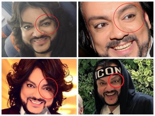 Так, специалисты заметили, что у Филиппа серьёзные проблемы с левым глазом. Веко буквально начало опускаться. Киркоров знает об этом дефекте и старается скрыть лицо за длинными волосами. Кроме того, Филипп красит глаза, чтобы скрыть проблему.