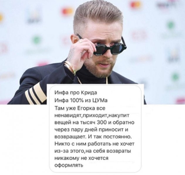 Иногда можно быть знаменитым и не иметь денег на поддержание образа, тогда приходится изощряться и прибегать к разным унизительным уловкам. Некоторые обедают за счет фанатов или посещают светские мероприятия ради фуршета, другие пытаются найти дизайнеров, которые предоставят одежду и аксессуары в обмен на рекламу, третьи выворачивают свое «грязное белье» в скандальных ток-шоу. Егор Крид пошел другим путем. Он покупает вещи на сотни тысяч рублей, а через пару дней возвращает их обратно в магазины после концертов, соотвествующее сообщение со ссылкой на персонал ЦУМа недавно попало в Сеть.
