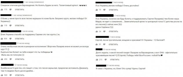 Стоит отметить, что поддерживают Сергея не только жители России. Украинцы также болеют за победу Лазарева на песенном конкурсе и оставили под клипом пожелания удачи и победы.