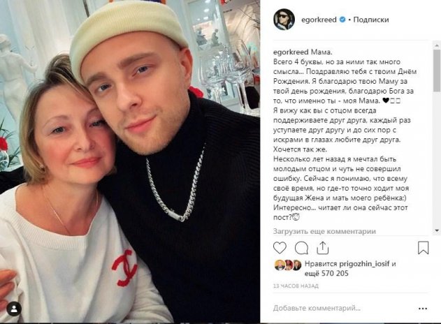 Егор Крид всегда с теплом относился к своей семье. Родители являются для певца главными людьми и достойным примером для подражания, а их крепкий брак всегда был гордостью и идеальным образцом. Рэпер с юных лет был одержим браком, семьей и детьми, однако не сложилось. А сегодня певец намекнул на причину своего одиночества. Судя по всему, трогательные домашние посиделки в веселой, теплой компании в кругу любимых людей сильно растрогали Егора Булаткина, и он решил поделиться самым сокровенным.