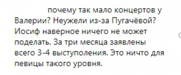 Ни для кого не секрет, что Валерия не входит в так называемый ближний круг Примадонны. Причины этого кроются в прошлом, когда она с Иосифом Пригожиным открыто встали на сторону Кобзона, негласно ведшего соперничество с Пугачёвой за главенство на отечественной сцене. С уходом Иосифа Давыдовича, позиции Валерии пошатнулись, несмотря на все усилия супруга. Более того, их дела выглядят не так радужно, как они хотят представить. Достаточно изучить афишу певицы на весенний период, чтобы увериться в этом – на три месяца заявлены всего 4 выступления, один из которых пройдёт за рубежом. Для певицы такого ранга, как Валерия, это мизерно мало и многие поговаривают, что это прямое следствие жестокого соперничества двух кланов – по-прежнему могущественного Пугачёвой и частично разгромленного Кобзона.