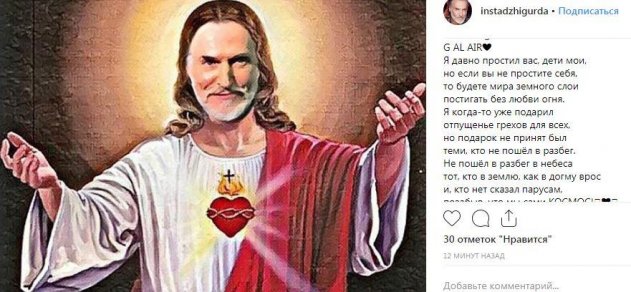 Джигурда в своём аккаунте в Instagram явно возомнил из себя Иисуса. Размещённая там фотография и пост не оставляют никаких сомнений. Подписчики уже советуют ему: «Побойся Бога!»