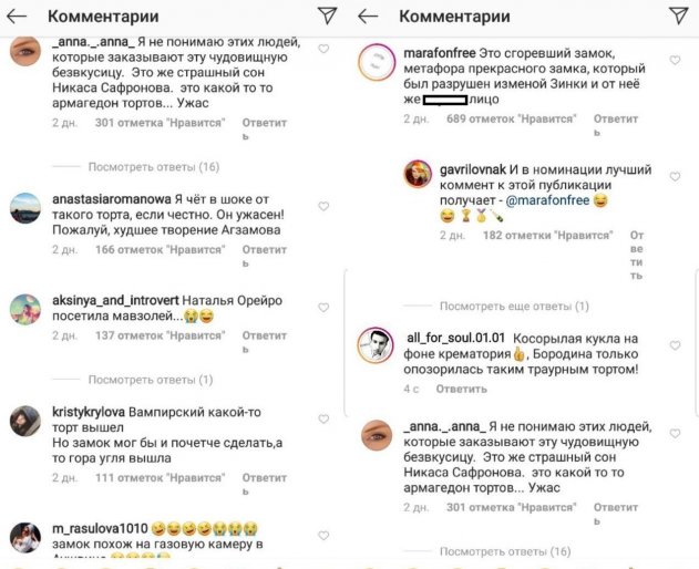«Вампирский какой-то торт вышел, но замок мог бы и почетче сделать, а то гора угля вышла», «Это Дом-2, который когда- то сожгут к чертям», «Косорылая кукла на фоне крематория.. только опозорилась таким тортом траурным»,- пишут подписчики в сети. У многих торт Ксении вызвал плохие ассоциации: хейтеры его называли: мавзолеем, склепом, пластмассовой подделкой, вампирским замком. А также в сети заметили, что после нескольких бокалов вина, Ксения очень стала похожа на статуэтку представленную Агзамовым с расплывшимися губами от ботокса и пьяненькими косыми глазами.