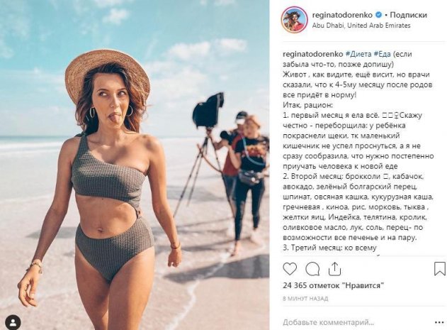 «Живот, как видите, ещё висит, но врачи сказали, что к 4-5-му месяцу после родов все придёт в норму!», - сказала знаменитость. Сейчас Регина старается придерживаться правильного питания, а для своих поклонниц Тодоренко подробно расписала как и что она употребляла на протяжении трех месяцев после рождения сына Михаила.