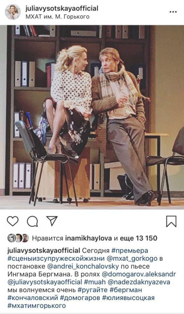 Известно, что Юлия Высоцкая - не только кулинар высшей категории, но и хорошая актриса. На днях она сыграла во МХАТе имени Горького в постановке по пьесе «Сцены из супружеской жизни». К слову, партнером по сцене главный Казанова России - Александр Домогаров. Необходимо отметить, что Юлия Высоцкая с таким «мужем» смотрелась более гармонично, чем с пожилым Андреем Кончаловским.