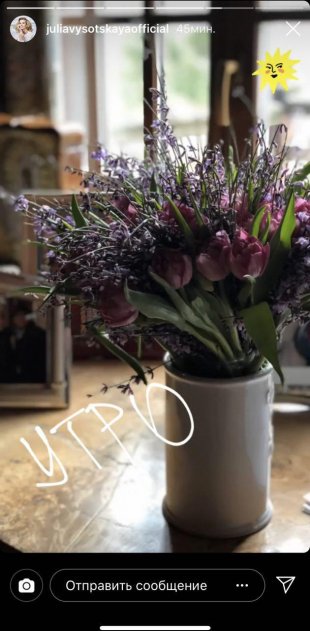 Юлия Высоцкая в сторис в соцсети выложила фото букета цветов - на первый взгляд может сложиться впечатление, что телеведущая хвастает подарками от новой пассии, Александра Домогарова. Как бы там не было, открыто о возможном романе актриса вряд ли расскажет, хотя и без того понятно, что Высоцкая в силу возраста мужа не сможет испытать всех радостей супружеской жизни.