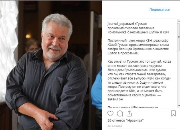 Актер Леонид Ярмольник стал настоящим антигероем. Его высказывание о КВН начали передавать все, и критика обрушилась на автора слов молниеносно. По мнению экс-судьи КВН, игра потеряла смысл и остроту в шутках именно после его ухода, то есть еще в 2012 году. В программе Hard Day's Night на «Дожде» он заявил, что в последние годы смотреть на игру стало вообще не возможно. В 80-х годах КВН был острым пульсом времени и стал кузницей творческой молодежи, что сейчас уже трудно увидеть. Причину падения уровня шуток Ярмольник не видит в цензуре, но пока не готов высказать. Гусман услышав эти комментария не смог сдержаться и сразу же дал ответ Ярмольнику, не обидев его но настояв на иной версии.