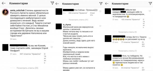 В комментариях тот час же начали перечислять образы и личности, к которым стремилась в разные времена сама Собчак. Подписчики предали сомнению адекватность телезвезды и напомнили ей, что она в своё время возомнила себя Путиным, Опрой Уинфри, а также в целом считала или считает себя журналистом, оппозиционером или же кандидатом в президенты. Основываясь на одиозных поступках Ксении, фолловеры решили, что ей самой следовало бы обратить внимание на своё «весеннее обострение».