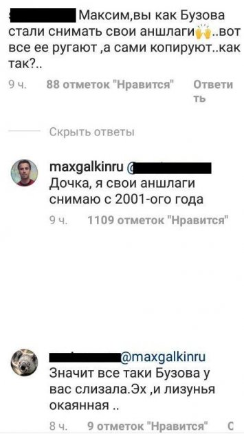 Максим четко ничего не ответил, а только вновь похвастался, что аншлаги были у него еще в 2001 году и продолжаются по сегодняшний день. Видимо, Бузова «выбилась в люди» и добилась успеха только благодаря Галкину, т.е. копирует его деятельность и всеми способами старается стать мировой звездой. Пока до мирового признания девушке далеко, но в России она считается самой популярной молодежной певицей.