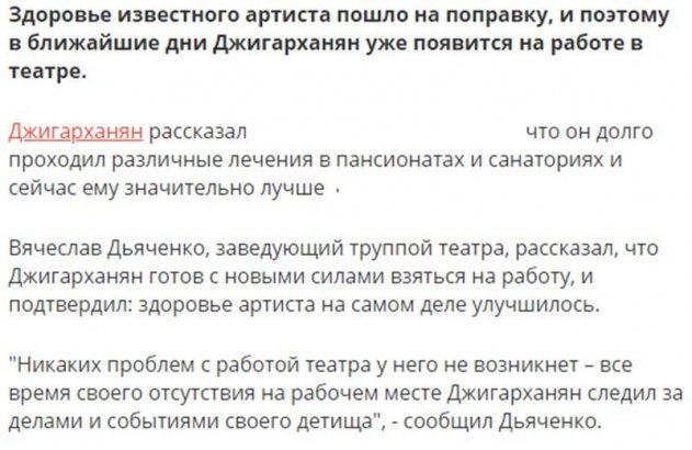 «Никаких проблем с работой театра у него не возникнет – все время своего отсутствия на рабочем месте Джигарханян следил за делами и событиями своего детища», - сообщил Дьяченко.