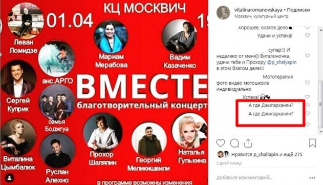 Однако, в комментарии Дьяченко не верят поклонники Армена Борисовича. Разобраться в ситуации очень трудно, ведь в соцсети Джигарханян не зарегистрирован и не имеет связи с поклонниками. Первой кому начали задавать неудобные вопросы стала Цымбалюк-Романовская. С 40-летней Виталиной Армена Борисовича связывала любовь и брак. Теперь же пианистка отмалчивается и не комментирует судьбу своего экс-возлюбленного. Паника вокруг пропажи экс-мужа Цымбалюк-Романовской бьет рекорды. Лишенные информации фанаты штурмуют соцсети Виталины с единственным вопросом: «Где Джигарханян?».