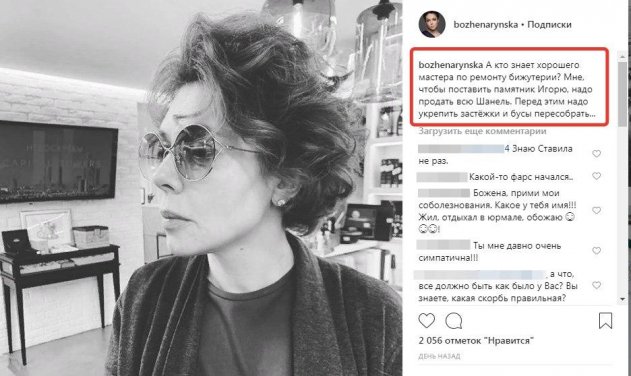 А на днях на её странице в Instagram появился пост о том, что Божена просила помочь ей найти мастера по ремонту украшений. Журналистка хочет отремонтировать и продать все украшения «Шанель», а на полученные деньги поставить памятник супругу.