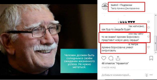 83-летний артист Армен Борисович Джигарханян не появляется на публике, только передает интервью. Реже стал бывать в обществе актер после громких разбирательств с экс-женой Виталиной Цымбалюк-Романовской. Пианистка по образованию быстро нашла замену Армену и начала открывать новые грани совместной жизни с доверчивым мужчиной. Звезда легендарных лент без оглядки верил Виталине, но она даже не пыталась быть ему верной и примерной – сама лично снимала видео, чтобы следить за Джигарханяном. Эта история очень подкосила Армена Борисовича и только теперь, спустя полгода он вроде бы готовится к возобновлению нормальной жизни. Выйти на работу и вновь окунуться в дела в ближайшее время планирует Армен Борисович. Так заявил завтрупой театра имени Армена Джигарханяна Вячеслав Дьяченко. В соцсети Instagram Джигарханяну написали весьма неоднозначное пожелание.