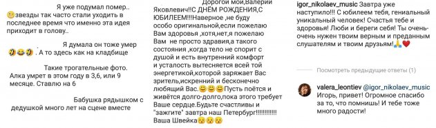 Поклонники неоднократно повторяли Валерию Яковлевичу о необходимости регулярных визитов к врачу, но не похоже, что певец прислушался к ним. В новом видео он выглядит усталым, поникшим и словно выдавливает из себя слова и улыбку, отметили подписчики. В личных обращениях к другим знаменитостям Валерий Леонтьев не забывает поблагодарить их за то, что помнят о нём. А от приближённых к главным звёздам России людей только и звучат пожелания здоровья и долгих лет жизни.
