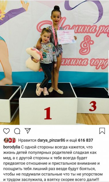 Телеведущая Дом–2 Ксения Бородина похвасталась с подписчиками достижениями своей дочери Маруси – она заняла первое место на соревнованиях по гимнастике. Выложив фотографию, Ксения выбрала странный пост для подписи победной фотографии Маруси с младшей сестренкой - Теей. Ксения сразу стала оправдываться за первое место и жаловаться на нелегкую жизнь популярных родителей.