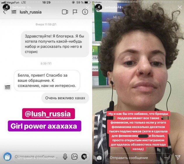 Тележурналистка была шокирована отказом косметического бренда, который не захотел сотрудничать с блогеркой в обмен на бесплатную серию товаров. Напомним, что именно с такой просьбой Белла Рапопорт обратилась накануне к пиар-менеджеру Lush. Отказ Белла восприняла слишком близко к сердцу, обвинив магазин в хамстве. На её защиту стали многие российские отпетые феминистки, вроде Тины Канделаки и Ксении Собчак.