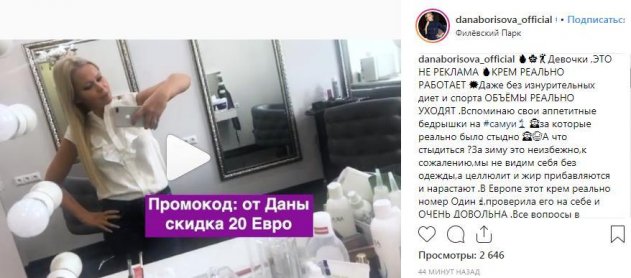 При этом траур по певице не помешал Борисовой у себя в микроблоге разместить рекламный пост и рассказать, как при помощи одного крема можно легко избавиться от лишнего веса, жира и целлюлита. Поклонники в комментариях посчитали, что вместо похорон Борисова пошла в салон, чтобы записать рекламу и заработать на ней, ведь деньги для неё все-таки важнее.