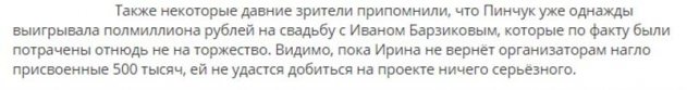 История щекотливая, якобы участница получила деньги на свадьбу, по итогам конкурса и не использовала их по назначению. Почему-то именно сейчас организаторы шоу вспомнили об этой ситуации. Поклонники не верят, что Бузова просто отпустила курьез и, может быть, эта история с 500 тыс. обрела новый смысл только после ссоры с телеведущей. Если учесть, что слова Ирины примут во внимание юристы, то возможно, согласно новым поправкам к Кодексу РФ об административных правонарушениях квалифицировать слова Пинчук можно как оскорбление и, возможно, как клевету. Если доказать, что в публичном выступлении Ирины, которое демонстрируют на ТВ она действовала против закона, то Пинчук может лишиться еще 1 млн рублей из-за ревности к Гриценко. Дорогая зрителям Ольга Бузова получила извинения от Романа и по предположению зрителей «Дом-2» сегодня получит слова извинений и от Иры Пинчук.